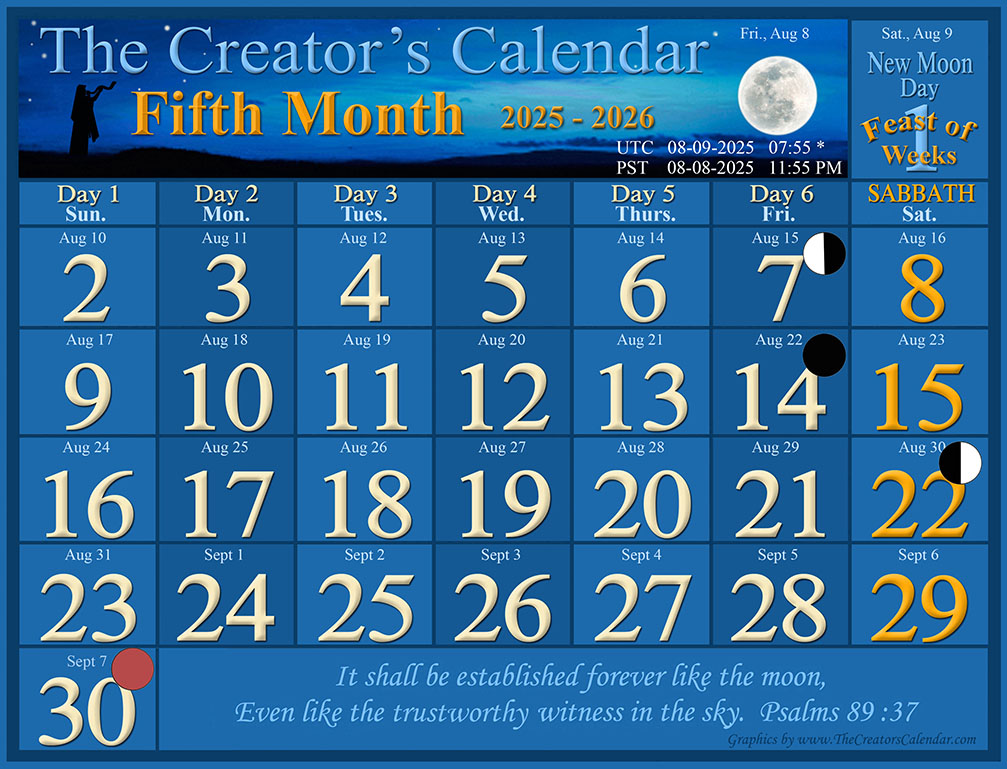Because the full moon is mobile, the Creator’s Lunar International Dateline (CLID) is also mobile, causing the true lunar dateline to occur in a different location each month based upon the first observable full New/Renewed Moon location. The easiest way to convert the calendar to your own Time Zone is with this one specifically for the United States. UTC – TIME ZONE CONVERSION CHART. For those outside this country, search online for the one for your time zone.